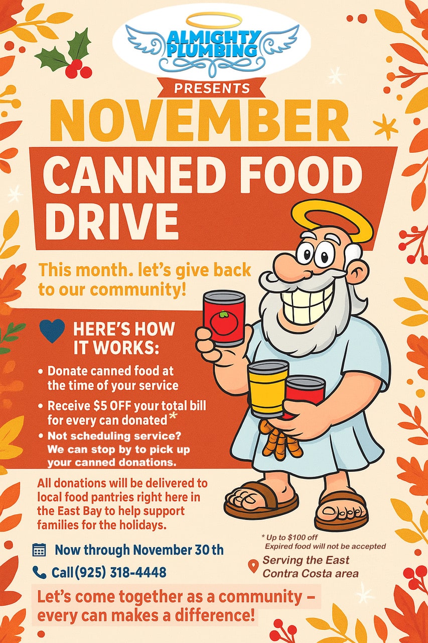 Join Almighty Plumbing’s Canned Food Drive! Donate canned goods during your service call and receive $5 off per can (up to $100).